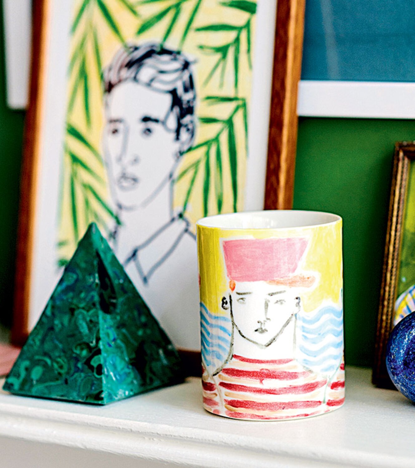 From a young age, Luke cultivated his collector’s eye. “I always had lots of stuff on display, lots of bits and pieces,” he says. “I would perfectly arrange whatever I was collecting – be it Lego or shells from the beach – on my bedroom shelves, which is basically what I still do now.” He has since traded the toys and shells for ceramics, glassware, old books, minerals (like chunks of malachite and fool’s gold) and eclectic vintage objects from antiques stores and eBay. His advice for unearthing gems: “Trust your instincts and buy the things you instantly fall in love with. Don’t fret too much. It doesn’t matter if they’re valuable or not, or if you don’t know where they would go. If you love something, get it.”
