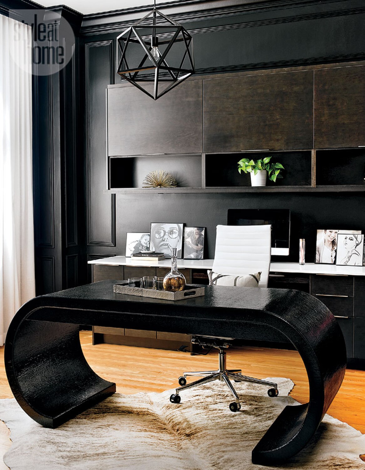The rich black walls offer a moody, masculine look and also camouflage the dark cabinetry. While the moulding gives the office added character, intriguing elements like the vintage Karl Springer-like waterfall desk and the geometric pendant light create a dramatic setting.