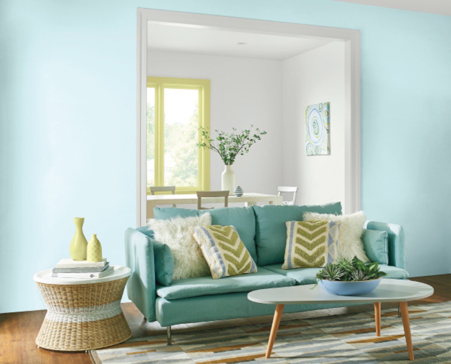 Traditionally found in cozy cottages in the French countryside, a room with powder blue walls offers a welcoming and homey feel. Give the traditional room a modern reboot with sculptural or Mid-Century Modern dining chairs, golden touches like an industrial light fixture or serving tray, and colourful abstract artwork. As for which hue of blue to choose? BEHR's “Peek-a-Blue” is a foolproof pick.