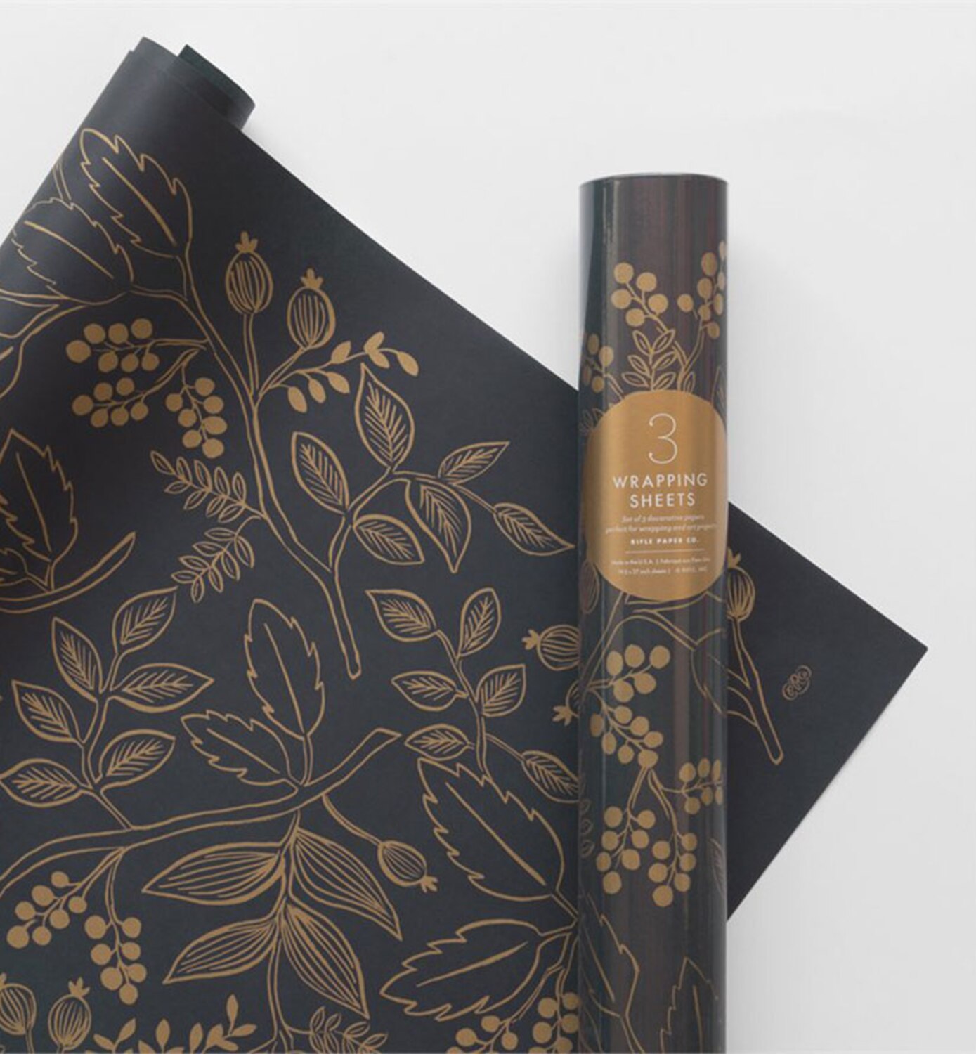 If you're not one for bold reds and greens, this gorgeous paper with its metallic gold print is perfect for adding that festive touch to your gifts without going over the top. Rifle Paper Co. Queen Ann Roll Wrap, Indigo, $10.95.