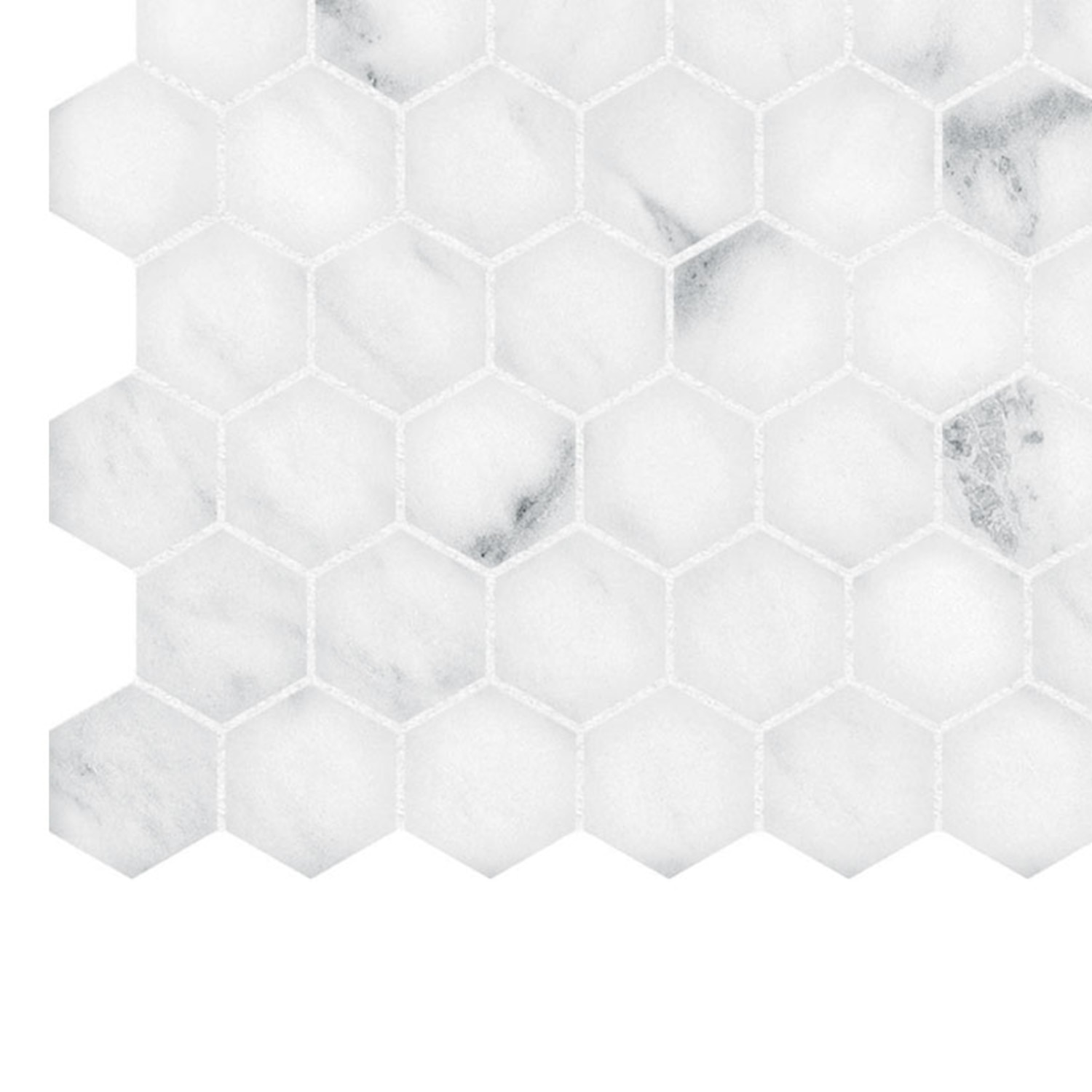 Rebecca hung a pair of tall white-framed mirrors above the his-and-hers sinks. They echo the rectangular shapes in the wall tiles, vanity, sinks and faucets, and subtly juxtapose the spherical sconces. The vanity appears to float, creating the illusion of space, but it’s not actually wall mounted.