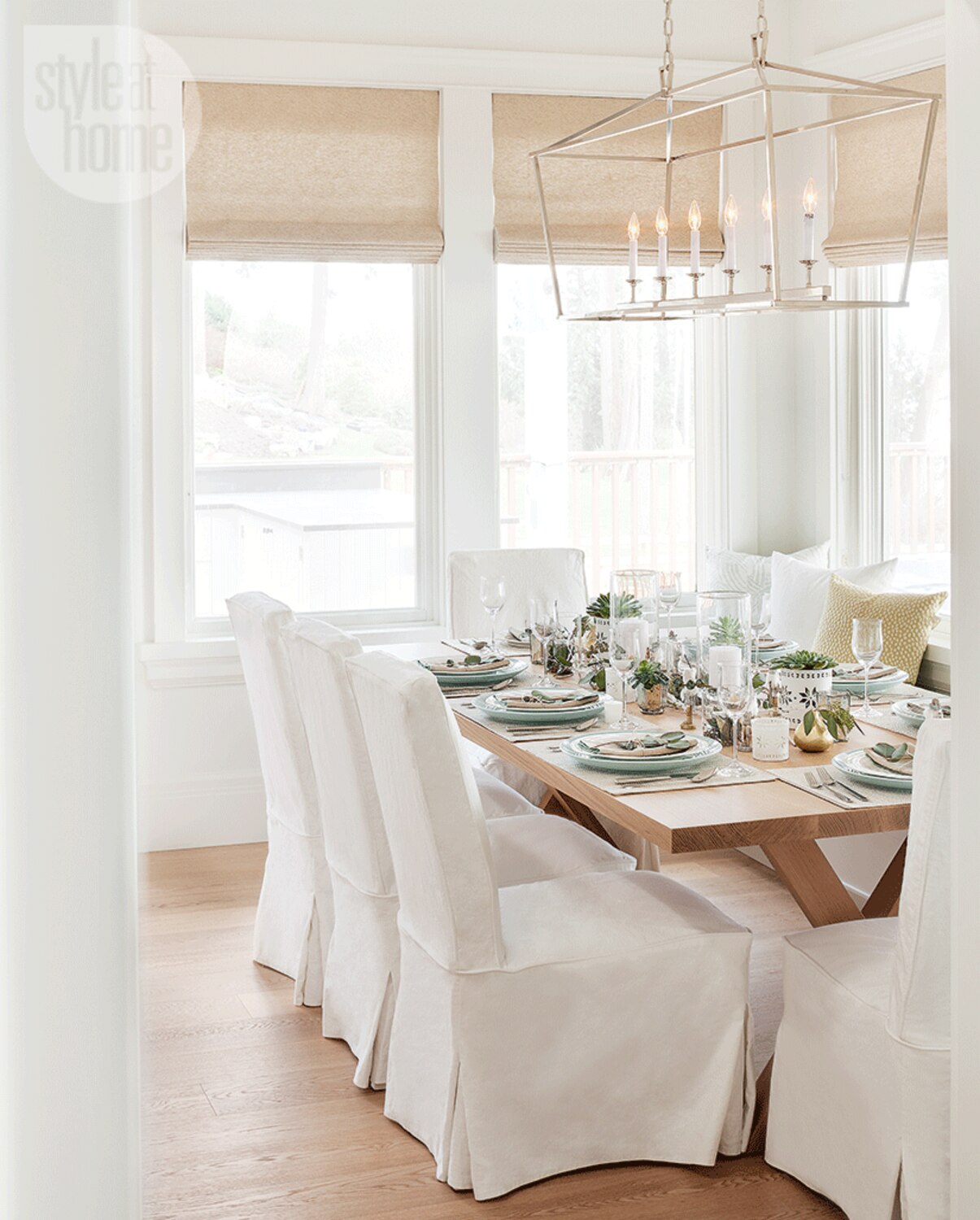 The kitchen’s large eat-in area boasts comfortable slipcovered chairs, a generous banquette and breathtaking views. A palette of white, pale aqua and earthy beige tones gives the holiday table setting a modern look and ties in with the rest of the home.