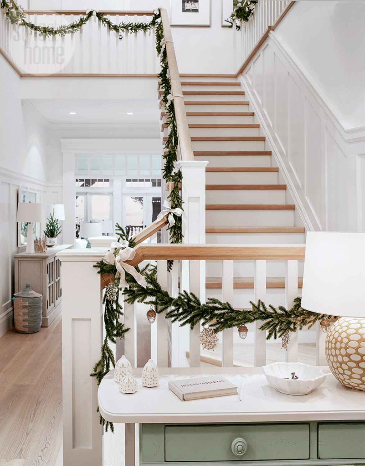 In the grand entryway, the banisters are decorated with faux evergreen garland embellished with pretty bows and delicate acorn and snowflake ornaments. Whether store-bought or DIY, the cottage's holiday adornments offer a handmade feel that’s both whimsical and cozy.