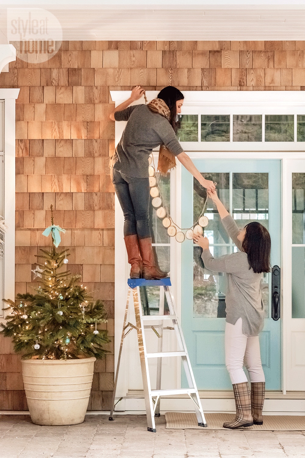 “We didn’t want anything to take away from the beautiful turquoise door,” says Nicole. So the designers strung a simple wood-disc garland that says “Merry Christmas” along the transom window.