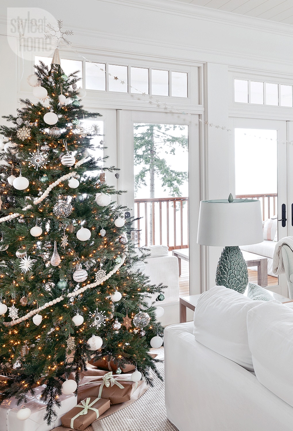 tThe faux Christmas tree is adorned with a simple felt ball garland and a collection of ornaments in a predominantly neutral colour scheme. “The tree trimmings range from traditional to modern,” says Nicole. “We wanted the tree to look collected with a lot of different decorations. But keeping the colours consistent makes them all work together.”