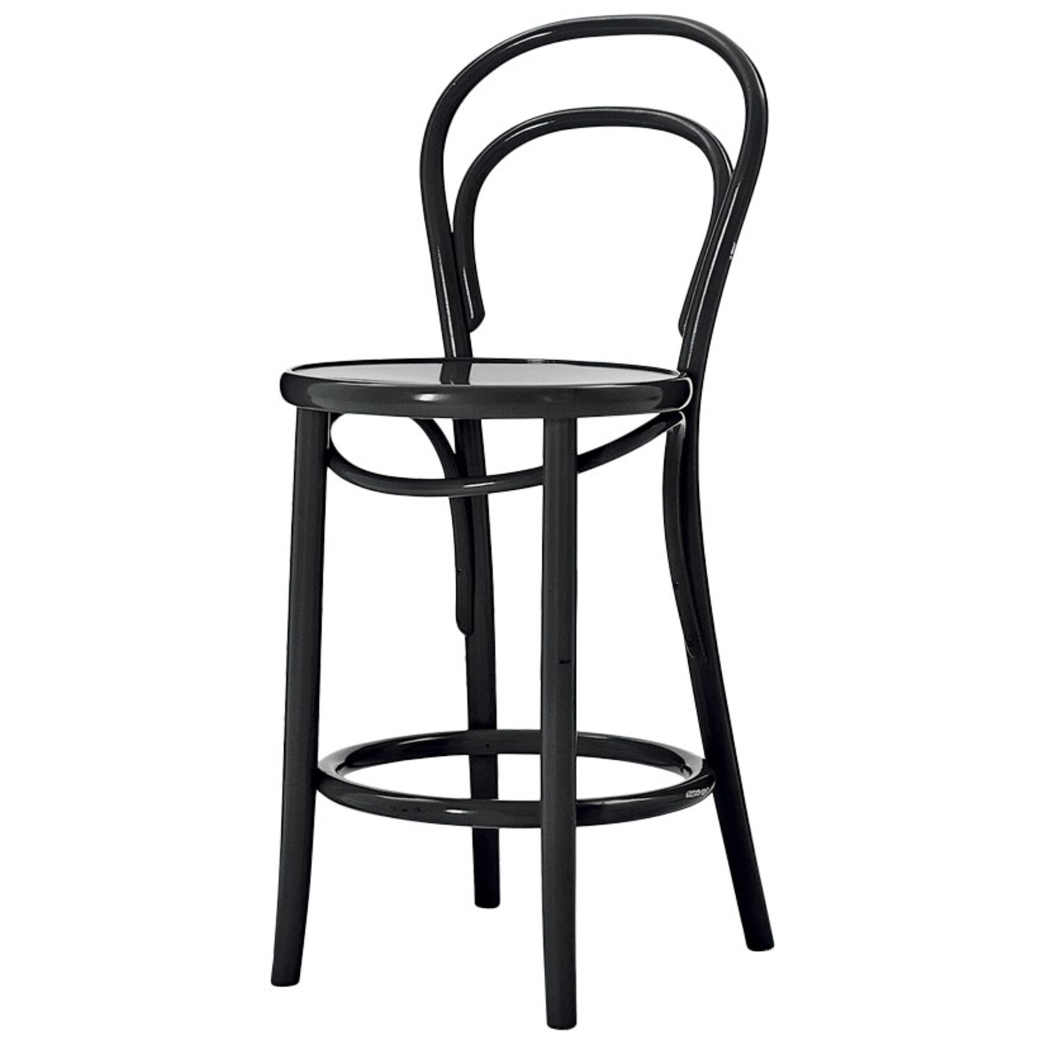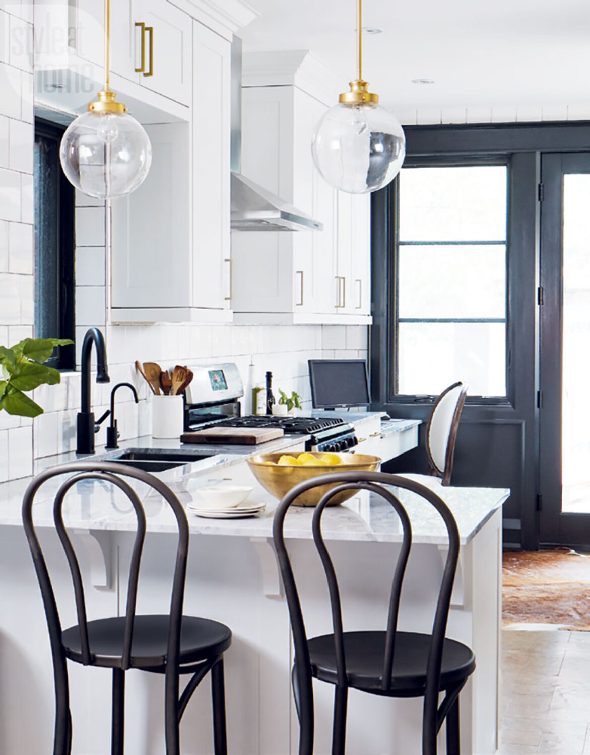 A black and white palette, square-tiled backsplash, shaker-style cabinetry and iconic furnishings blend perfectly in this modern and traditional space.
