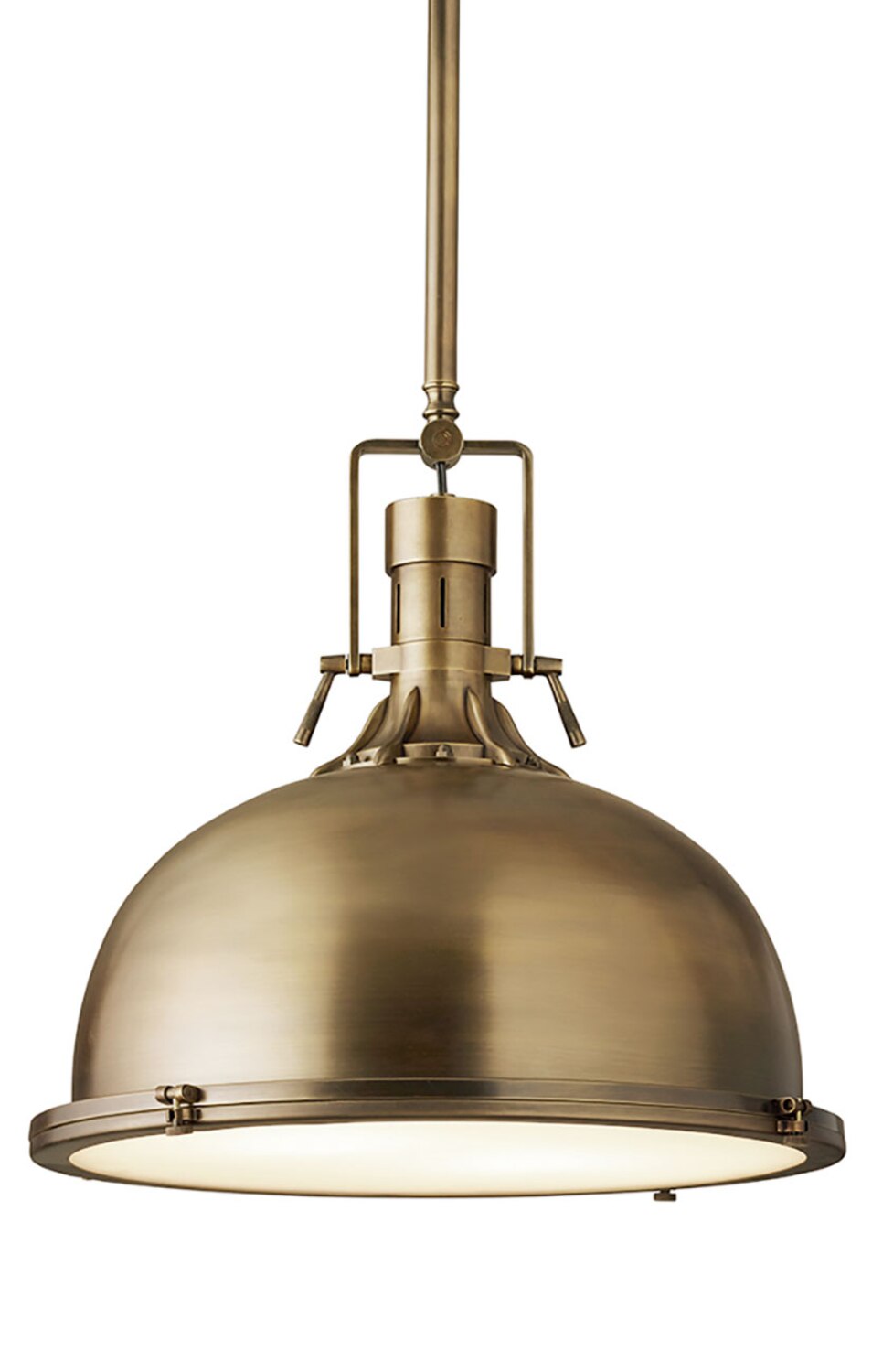 Brass-plated steel Harmon pendant light in Antiqued Brass, 15", $775, RH Restoration Hardware.