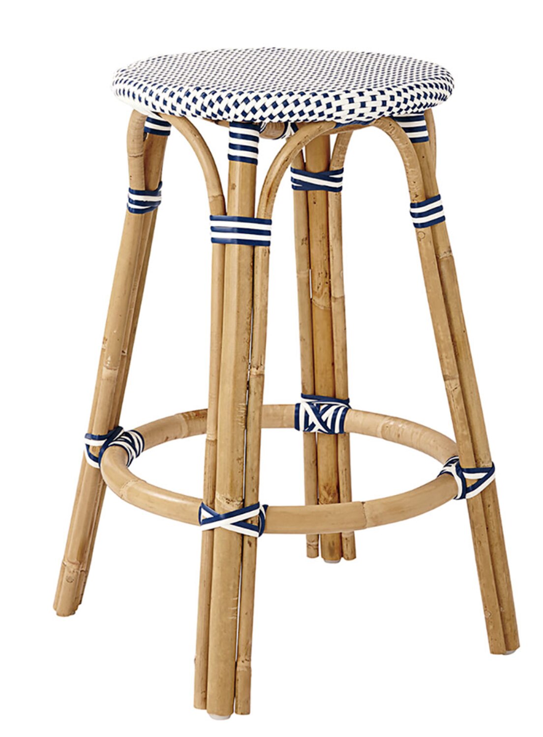 Rattan and woven plastic Riviera backless counter stool in Navy, $228 US, Serena & Lily.