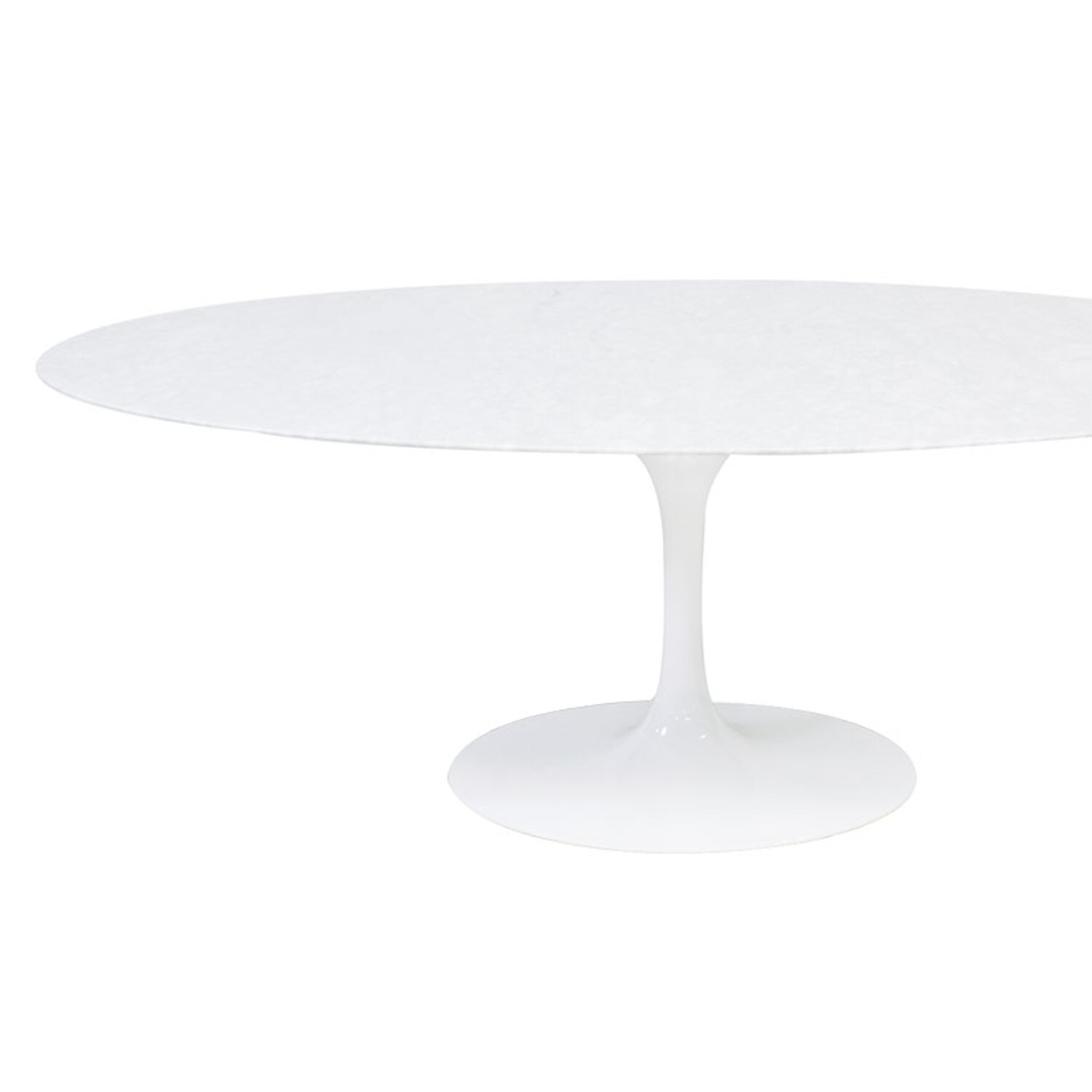 Defined by a mix of old and new, the eat-in area features a Mid-Century Modern Saarinen dining table surrounded by Louis XVI-style dining chairs with wipeable white vinyl seats. “Those chairs used to be in my dining room,” says one of the homeowners. “They’re probably 36 years old and have been re-covered several times.” The windows and French doors lead to the backyard and let in lots of natural light.