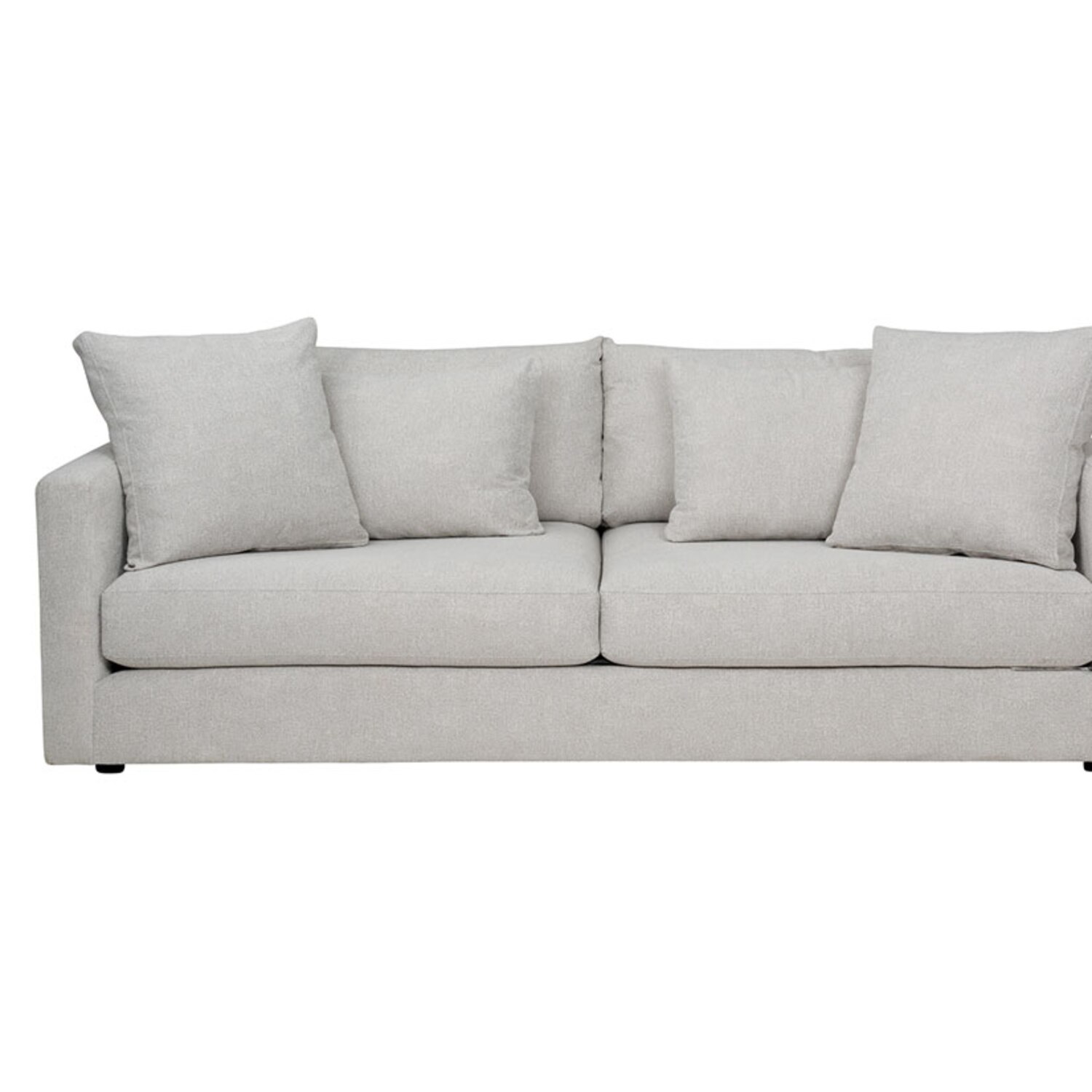 Polyester Berg sofa in Aiden Platinum with plastic legs, $2,093, urbanbarn.com.