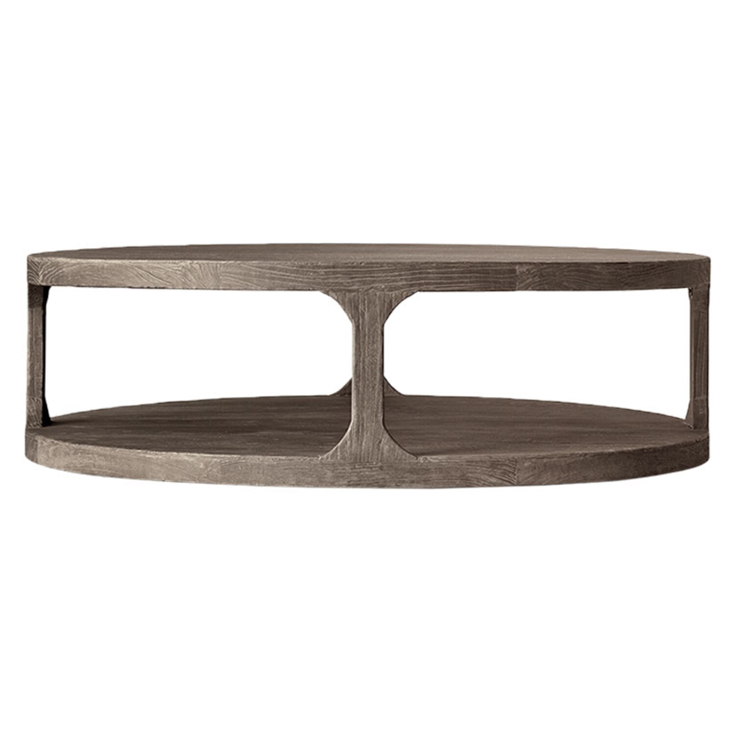 Solid elm Martens round coffee table in Aged Brown Elm, 36", $2,395, restorationhardware.com.