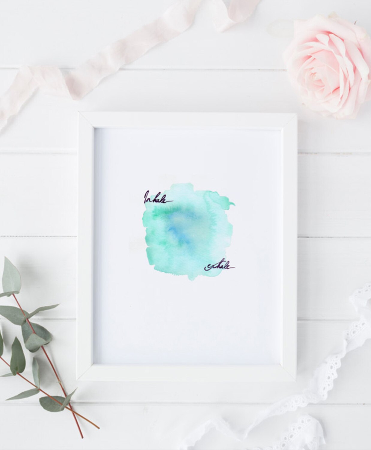 A dreamy, hand-painted watercolour print featuring the words "inhale, exhale". Author: The Happy Yogi