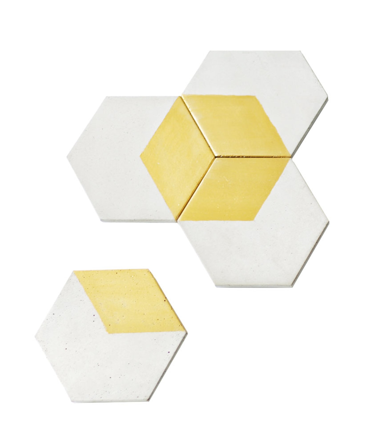 Concrete Hex coasters in Gold, Mindtheminimal on Etsy, $30 per set of 4.