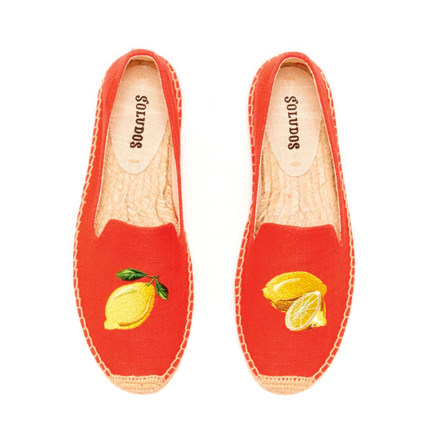 Embroidered smoking slippers in Lemon Coral, Soludos, $65 US.